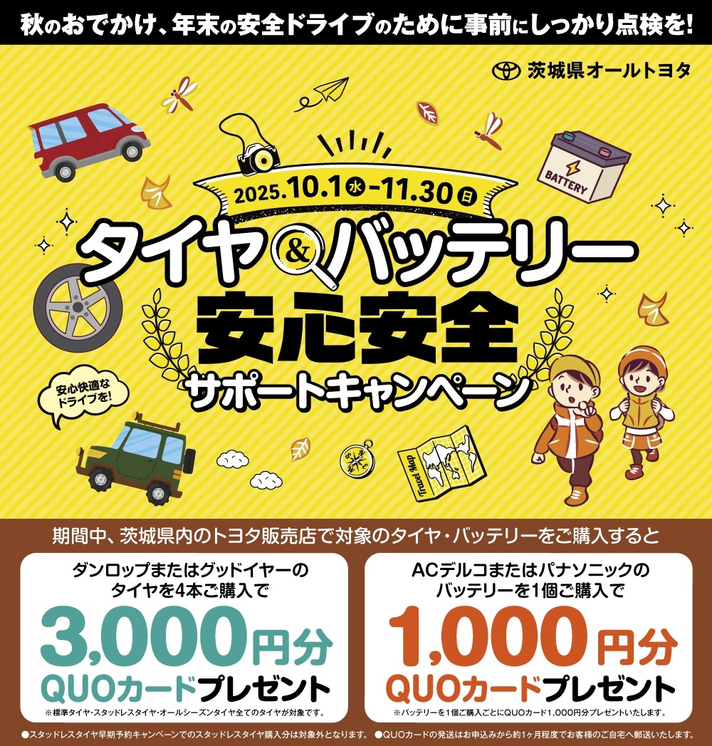 3000円と1000円のクオカードがもらえる、タイヤとバッテリーのキャンペーンは