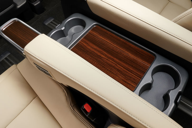 ゲストをもてなす機能を充実させました。電動でオットマンの展開・収納とリクライニング操作が可能。アームレストには、美しい木目調加飾とメッキ加飾を施したフタ付きカップホルダーを設定。またリヤ席1列目の間には、木目調加飾の折りたたみ式サイドテーブルを設定しています。